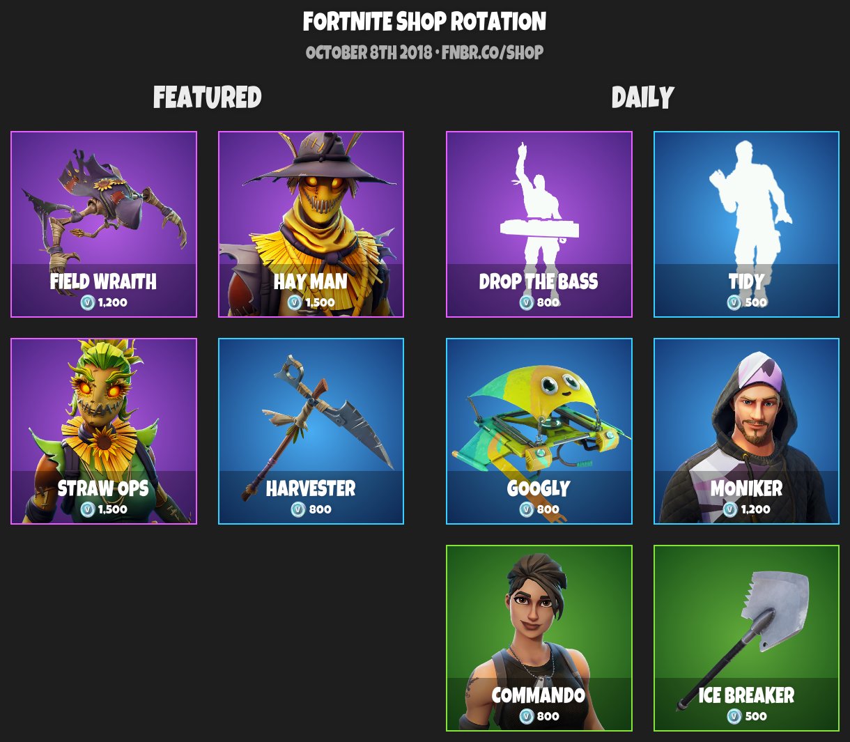 View the current item shop , a list of all available cosmetics , and more. Fnbr.co is an unofficial cosmetics directory for fortnite: You can request the images for a specific cosmetic or search up to 15 with the same name. If you wanted to find the images for 'ghoul trooper' you would get a response like this: We offer a developer api, if you wish to request access please contact us on discord. Fnbr.co fortnite bot to view the current item shop and automatically post it at reset (00:00 utc) 5 votes this month. Apr 26, 2021 · stepping outside the solitary shadows, this underworld inhabitant now joins the fortnite crew.